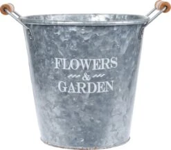 Seau/pot de fleurs en métal argenté. Un seau robuste, adapté par exemple comme pot de fleurs/plantes, mais aussi comme seau pour le jardinage ou la maison. Avec manche en bois pour une bonne prise en main. Matériau : métal. Dimensions : environ D24 x H25 cm. Capacité: environ 14 litres.