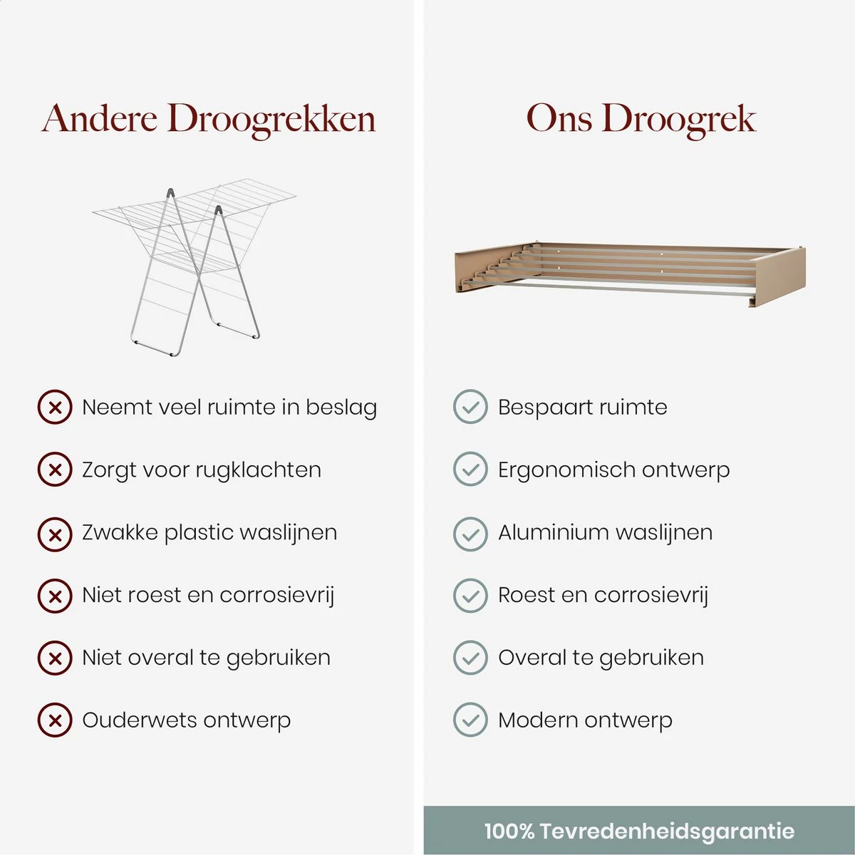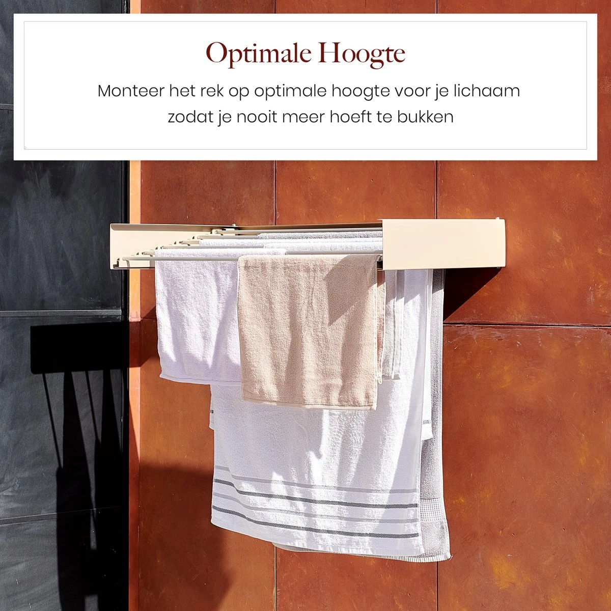 En plus d’offrir un espace supplémentaire dans votre maison et d’éviter un sol mouillé, le séchoir mural Homestic© présente également un avantage ergonomique. Dans de nombreux cas, le linge lourd et humide doit encore être soulevé du sol vers une autre pièce. Par la suite, ce linge doit également être accroché sur une grille qui n’est souvent pas de niveau optimal, de sorte que vous vous retrouvez souvent dans une position désagréable. Ce problème n’est pas reconnaissable avec le séchoir mural Homestic©. Accrochez le support à la bonne hauteur voor jou près de votre machine à laver pour éviter d’éventuelles plaintes au dos et au cou!