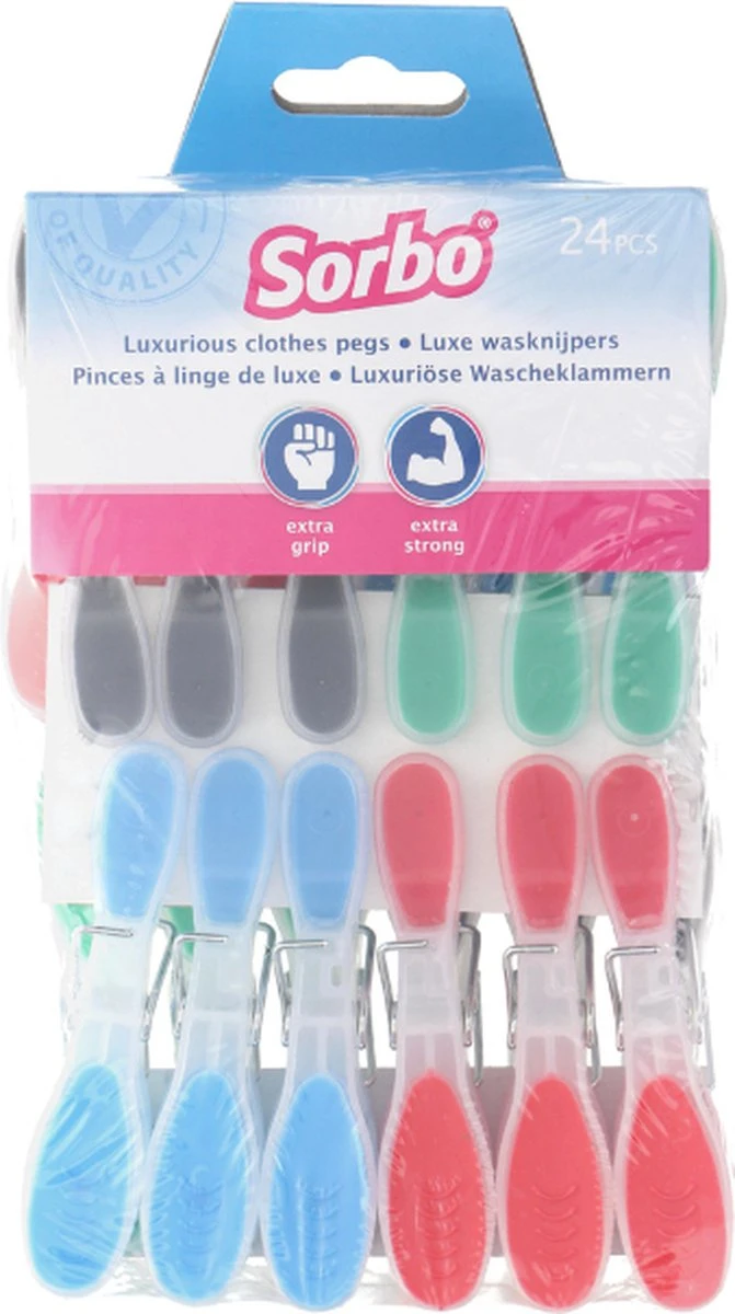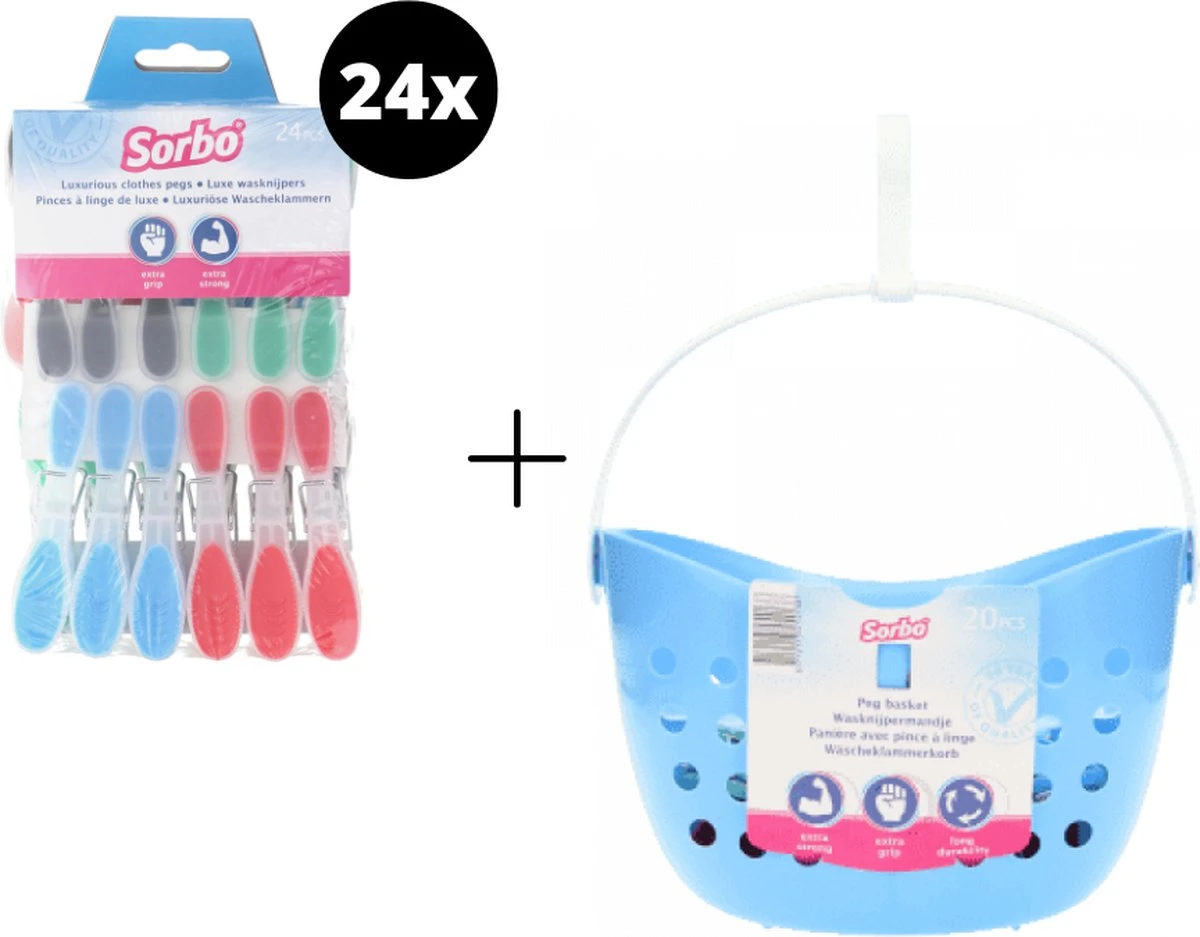 Pinces à linge Sorbo Plastique 24 pièces plus panier à pinces à linge Sorbo comprenant 20 pinces à linge Sorbo softgrip en plastique joliment traitées dans l’emballage sur la photo.