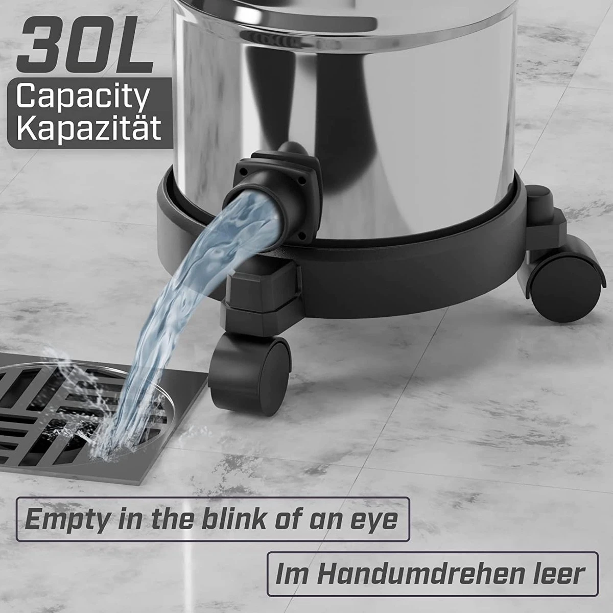 - Pratique : l’aspirateur multi-fonctions dispose d’un drain d’eau en partie basse, ce qui le rend très facile à vider. De plus, grâce aux roues à 360°, il est très mobile