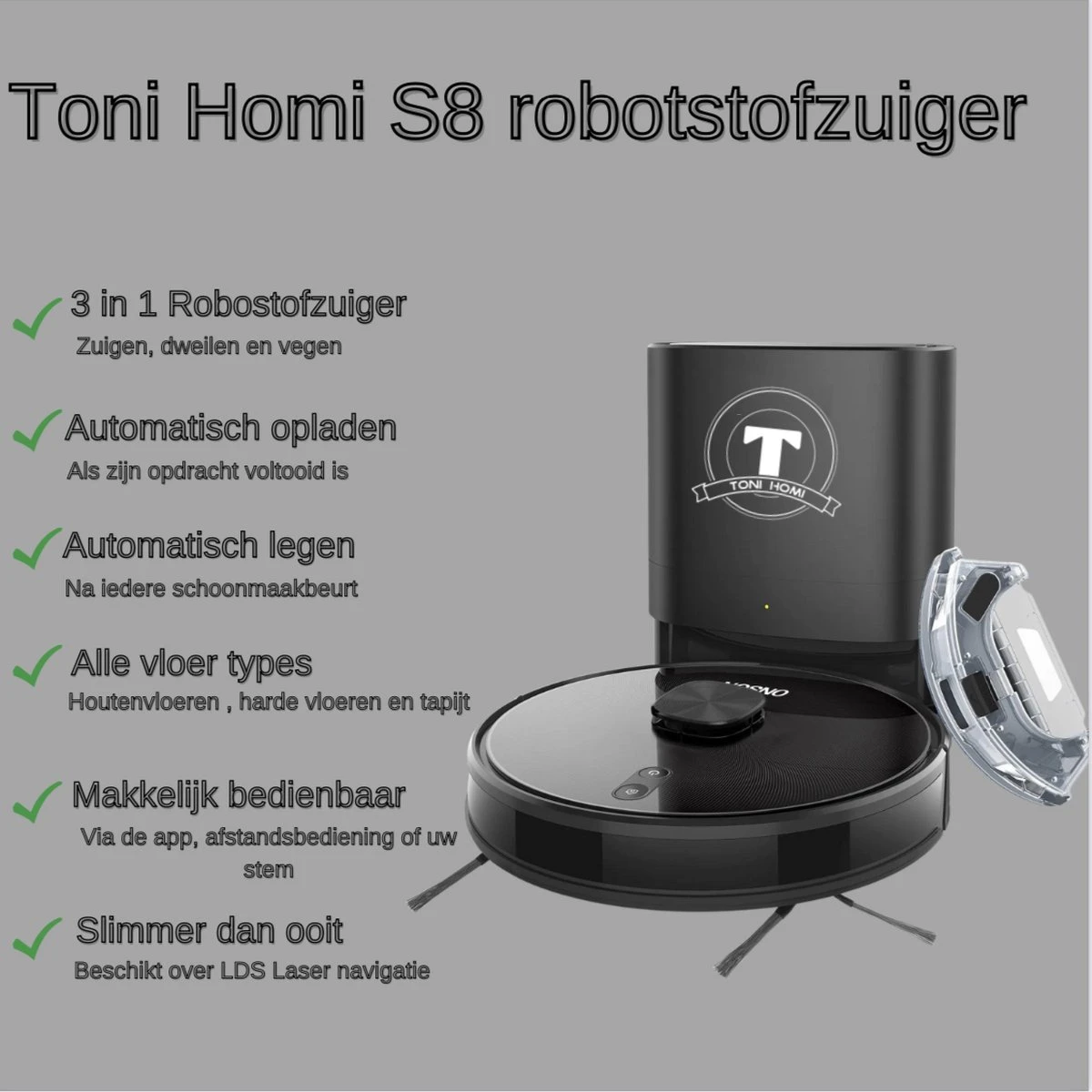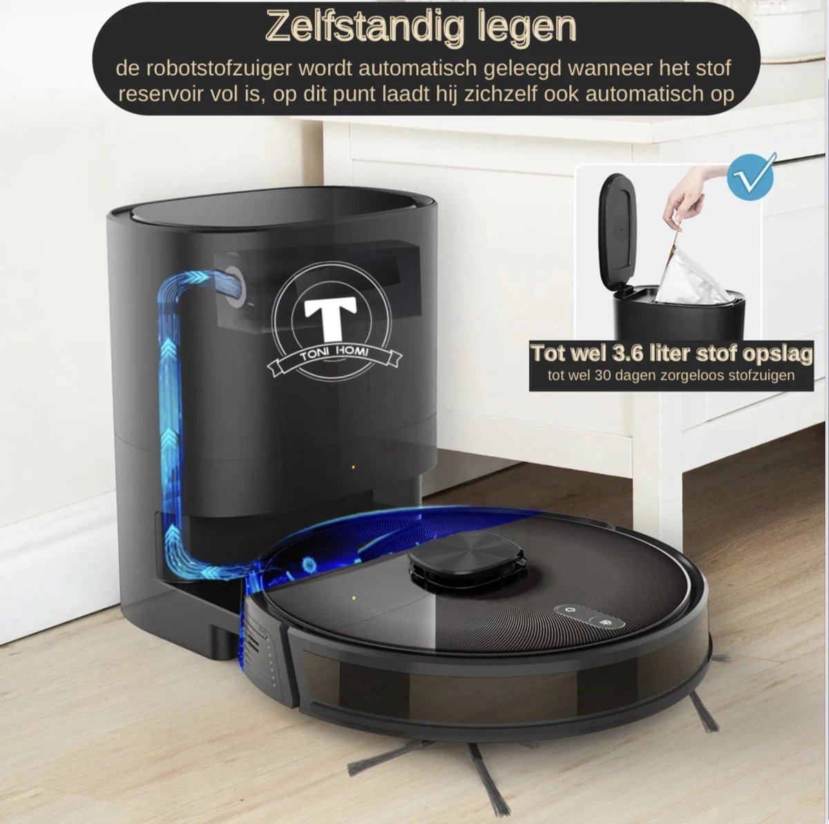 TONIHOMI® S8 – Aspirateur Robot Avec Fonction De Nettoyage – Vidange Automatique – Recharge Automatique – Navigation Laser LDS – Zwart